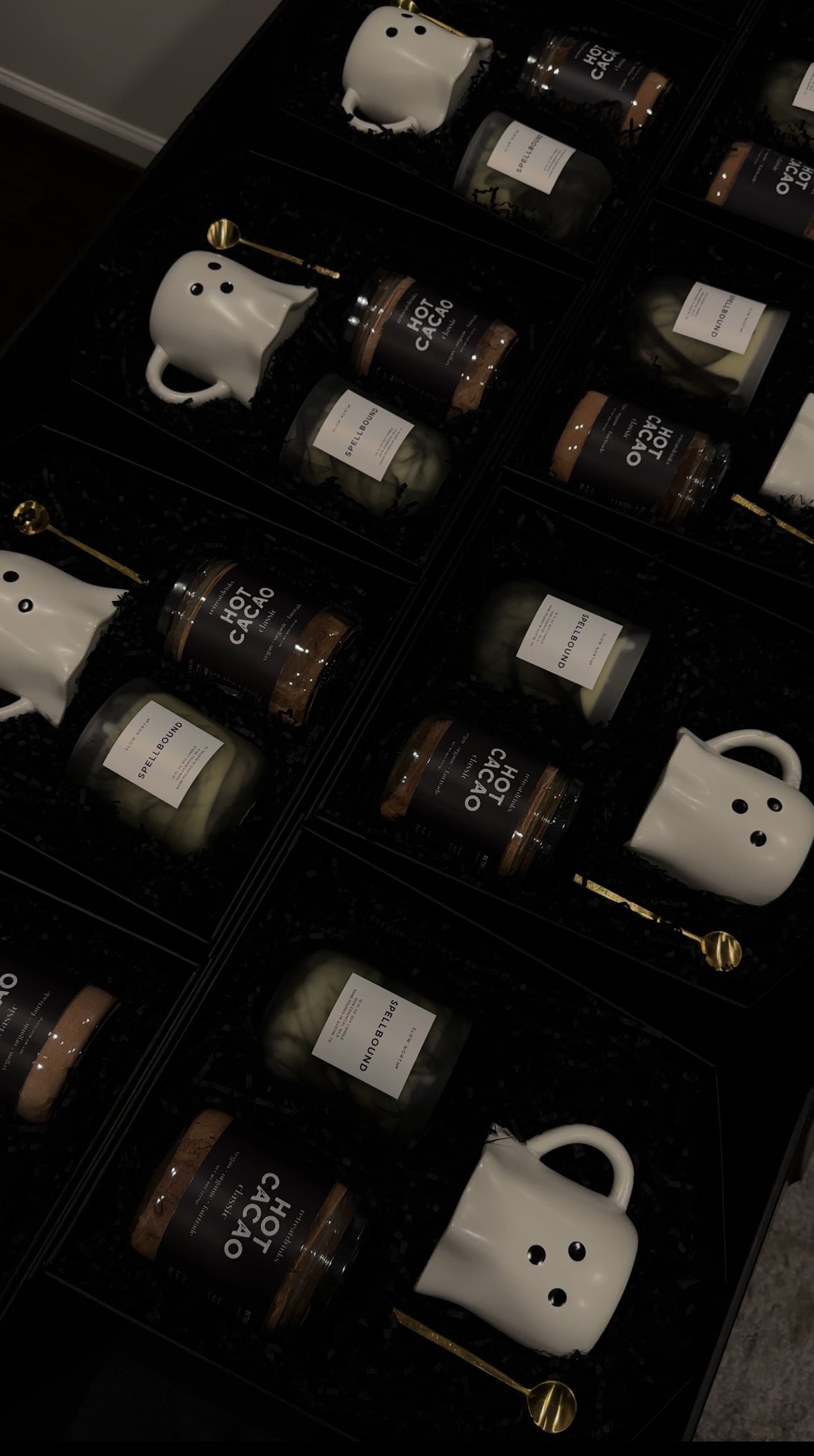 Get into the spooky spirit with our Cozy Boo Box — a chic twist on the viral boo basket trend. Inside, you’ll find everything you need for a snug Halloween night in: an adorable ghost mug, rich hot cacao, a warm seasonal candle, and a golden spoon to stir up the magic. Perfect for gifting or treating yourself, this box brings cozy vibes and a touch of playful spookiness to the season.